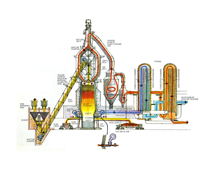 高炉生产是连续进行的。一代高炉(从开炉到大修停炉为一代)能连续生产几年到十几年。生产时,从炉顶(一般炉顶是由料种与料斗组成,现代化高炉是钟阀炉顶和无料钟炉顶)不断地装入铁矿石、焦炭、熔剂,从高炉下部的风口吹进热风(1000~1300摄氏度),喷入油、煤或天然气等燃料。装入高炉中的铁矿石,主要是铁和氧的化合物。在高温下,焦炭中和喷吹物中的碳及碳燃烧生成的一氧化碳将铁矿石中的氧夺取出来,得到铁,这个过程叫做还原。铁矿石通过还原反应炼出生铁,铁水从出铁口放出。铁矿石中的脉石、焦炭及喷吹物中的灰分与加入炉内的石灰石等熔剂结合生成炉渣,从出铁口和出渣口分别排出。煤气从炉顶导出,经除尘后,作为工业用煤气。现代化高炉还可以利用炉顶的高压,用导出的部分煤气发电。